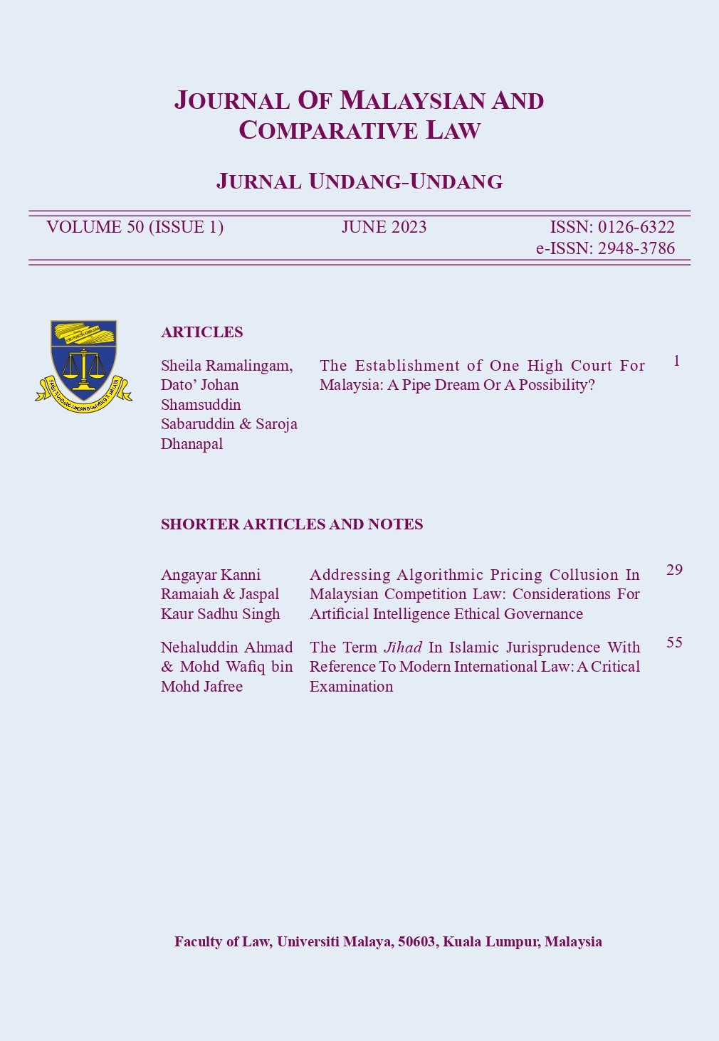 We end the year 2022 with the second issue of Volume 49 of the Journal of Malaysian and Comparative Law (JMCL). We are pleased to announce that starting from the first issue of Volume 49 published in June this year, JMCL is now available fully online via subscription. The previous volumes are fully accessible online without any subscriptions. This is to give JMCL more accessibility and visibility. Most importantly, it is to ensure that our articles reach audiences far and wide so as to impart, spread and share the valuable research and knowledge contributed by our authors.